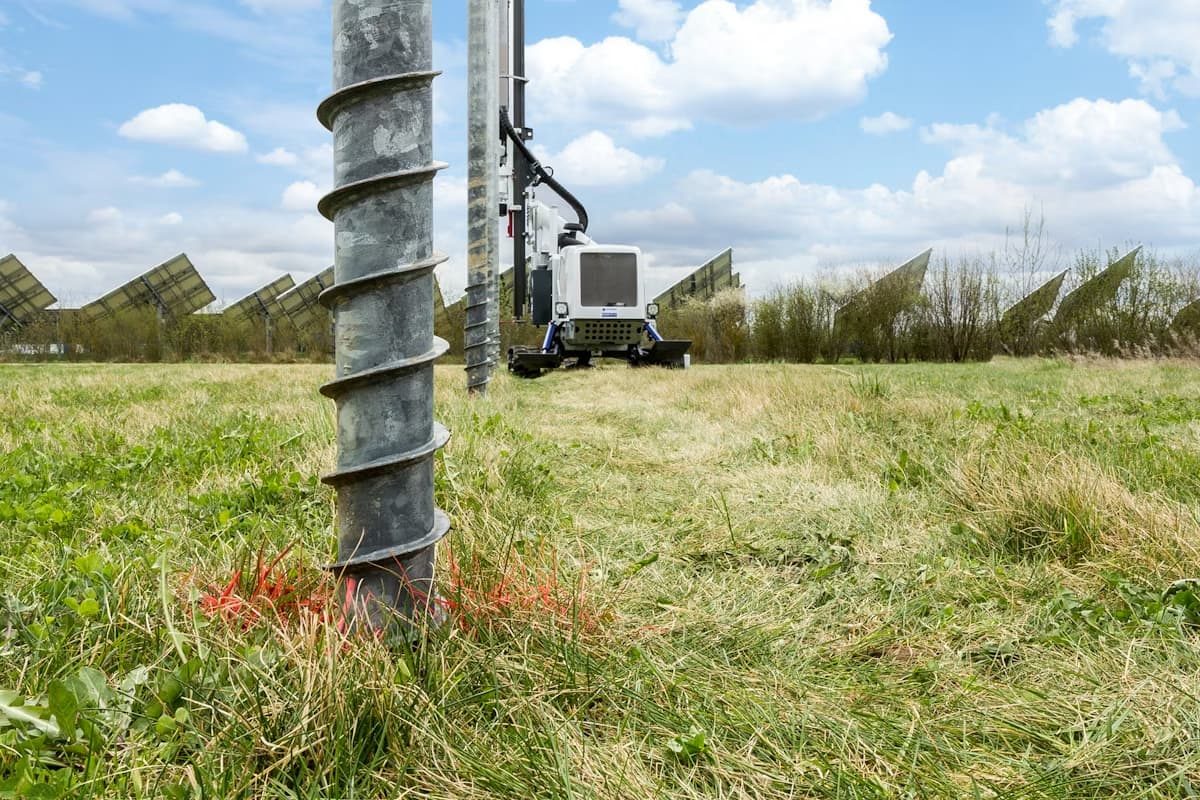 L’installation d’une vis prend 5 à 10 minutes. Avec une boulonneuse, une équipe pose 40 à 60 vis par jour. Les plots béton nécessitent plusieurs heures de gâchage et 21 jours de séchage.